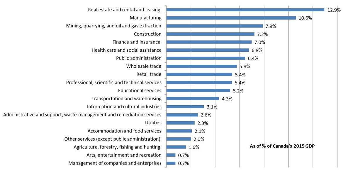 The chart below shows the share of industry sectors according to their relative contribution to the Canadian economy. Based on the 2015 data from Statistics Canada (GDP at basic prices), the Canadian economy is comprised of a broad range of sectors.