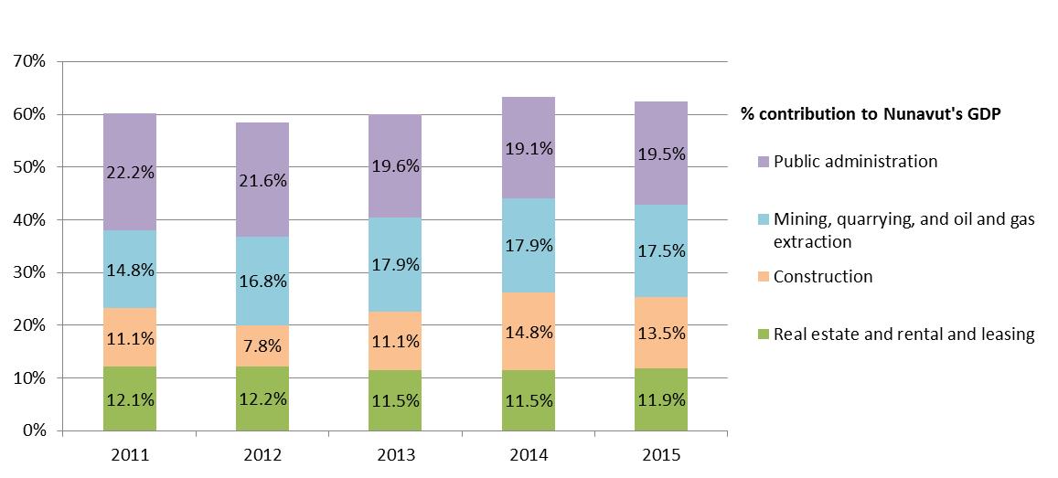 Text description: This graph shows the contribution of the four leading Nunavut industry sectors as a percentage of total GDP from 2011 to 2015.