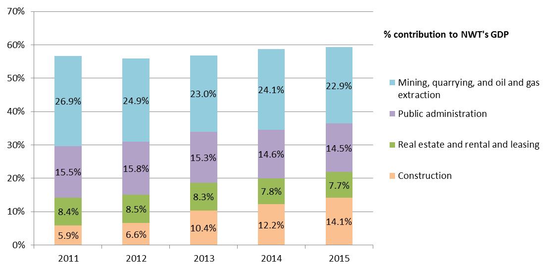 In 2015, mining, quarrying and oil and gas extraction remained the largest sector in the NWT. However at 22.9%, this sector dropped from the previous year and from its 5 year high of 26.9% in 2011. The construction sector has grown substantially over the last five years increasing, its contribution to the territorial GDP from 5.9% in 2011 to 14.1% in 2015. This growth is attributed to both private and public infrastructure investments, including the construction of the Gahcho Kué diamond mine and the construction of the all-weather road to Tuktoyaktuk.