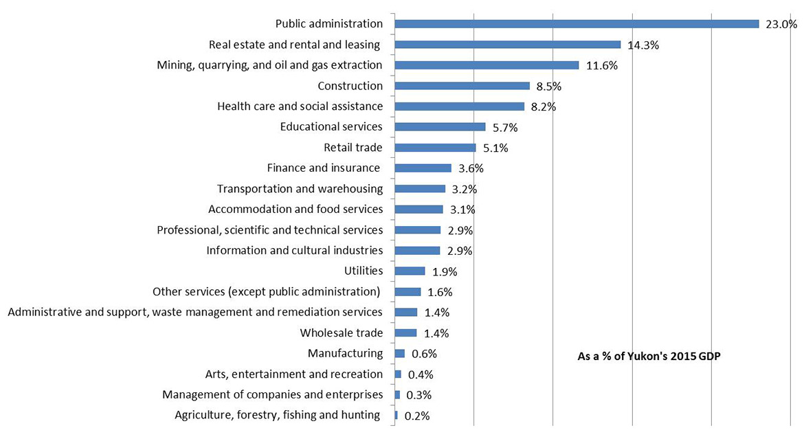 Text description: This graph shows the contribution of Yukon’s industry sectors as a percentage of total 2015 GDP.