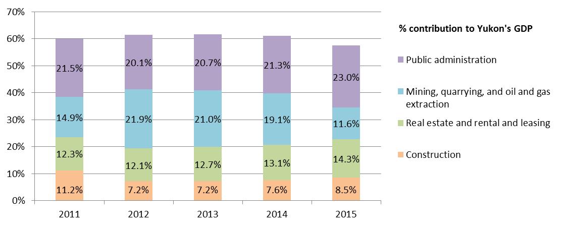 Text description: This graph shows the contribution of the four leading Yukon industry sectors as a percentage of total GDP from 2011 to 2015.