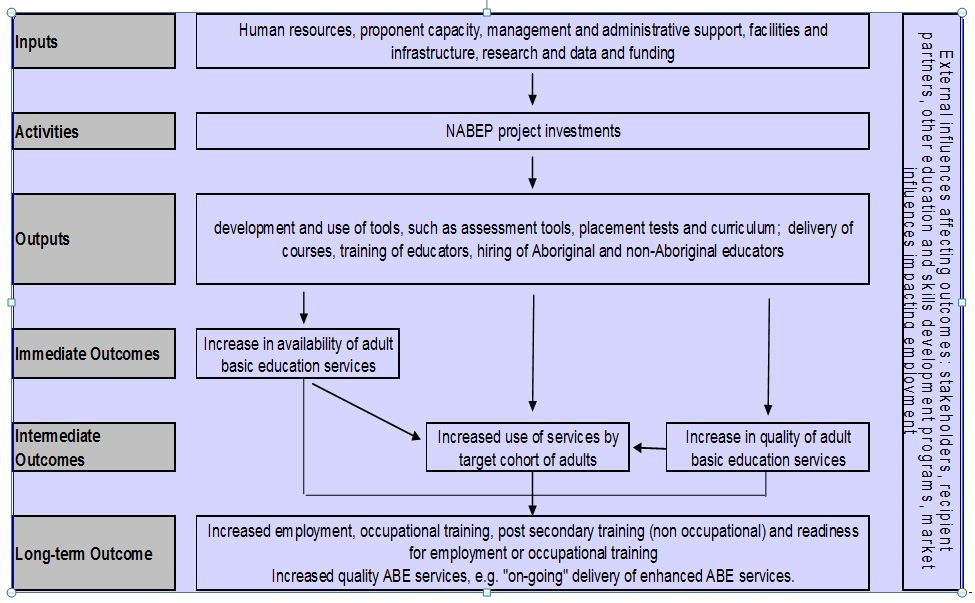 The expected immediate outcome resulting from the outputs is the increased availability of adult basic education services. The expected intermediate outcomes resulting from the outputs as well as the immediate outcome include the increased use of services by adults and the increased quality of adult basic education services. Lastly, the resulting long-term outcomes will be increased employment, increased occupational, post secondary or job-readiness training, and an increase in quality of adult basic education services.