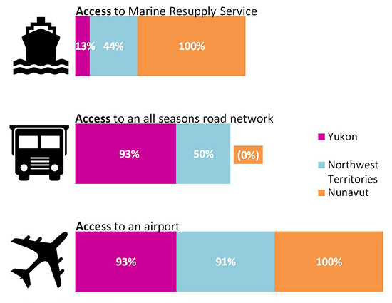 Across the territories, transportation networks vary significantly, particularly between Nunavut and the other two territories. Data is presented by the percentage of communities per type of transportation network with access.