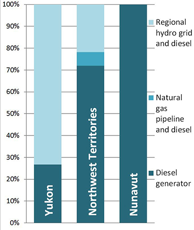 Diesel continues to be a significant source of community energy across the three territories. Data is presented by the percentage of communities per type of energy.
