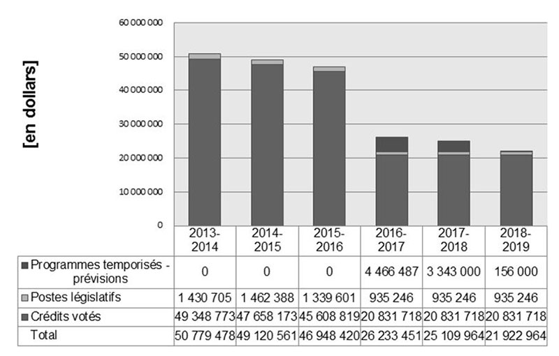 Les dépenses totales pour 2015-2016 ont diminué de 5,6 millions de dollars par rapport à 2014-2015. Une partie de cette baisse, soit environ 1 million de dollars, est attribuable à une diminution des coûts de fonctionnement, dont la plupart sont liés à un coût ponctuel de 620 000 $ en améliorations locatives engagé en 2014-2015. Cette diminution est principalement attribuable à des dépenses de contribution réduites en 2015-2016.