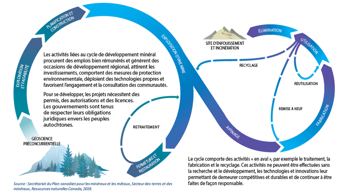 Les activités liées au cycle de développement minéral procurent des emplois bien rémunérés et génèrent des occasions de développement régional, attirent les investissements, comportent des mesures de protection environnementale, déploient des technologies propres et favorisent l'engagement et la consultation des communautés. Pour se développer, les projets nécessitent des permis, des autorisations et des licences. Les gouvernements sont tenus de respecter leurs obligations juridiques envers les peuples autochtones.