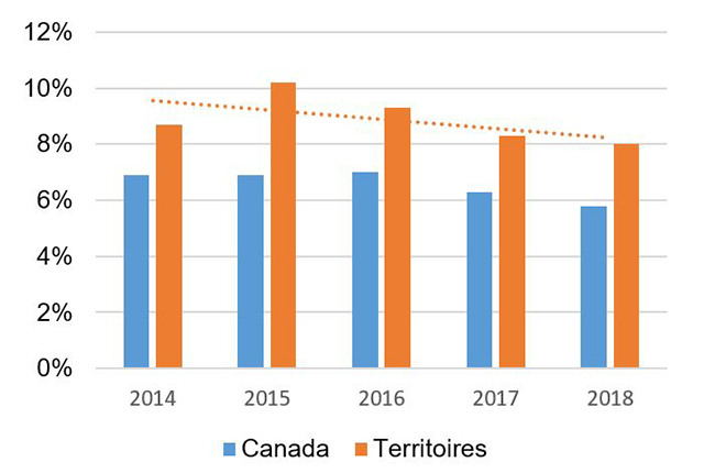 Le graphique représente le taux de chômage des territoires et du Canada de 2014 à 2018. Le taux de chômage dans les territoires est supérieur de 3 à 4 points de pourcentage, mais il est globalement en baisse.