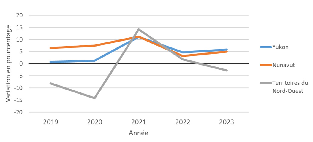 Ce graphique illustre les changements prévus du PIB entre 2019 et 2023 au Yukon, dans les Territoires du Nord-Ouest et au Nunavut.