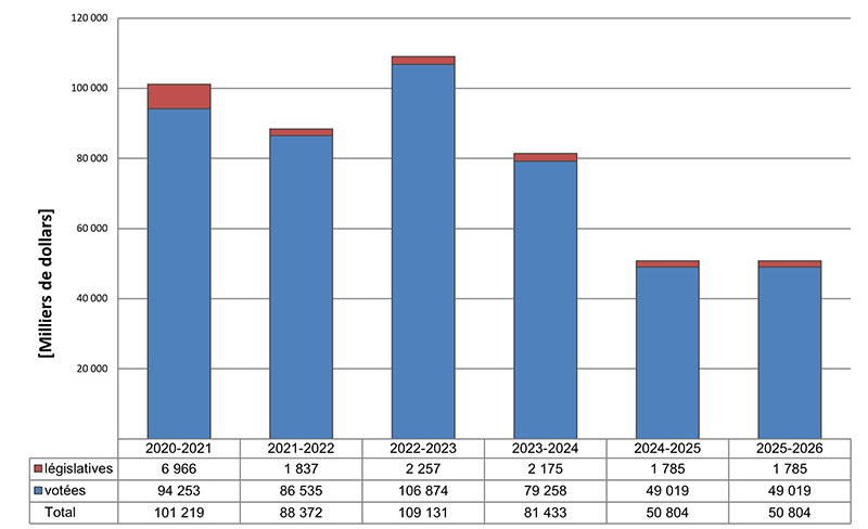 - Dépenses approuvées annuellement par le Parlement au moyen d'une loi de crédits. Le libellé de chaque crédit énonce les conditions selon lesquelles les dépenses peuvent être effectuées.